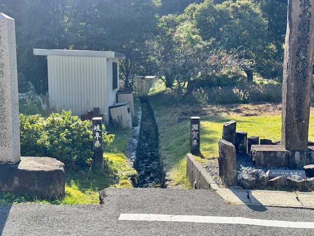 岐阜県と滋賀県の県境に見落とすくらいの小さな溝があります。かつてはその溝が美濃と近江の国境となっていました。そこには国境の標柱が建っており、寝物語伝説の場所となっています。その昔、京都から奥州へ落ち延びた源義経を追う静御前が旅の道中で長久寺の近江側の宿をとりました。隣の美濃側の宿には義経の家来の源造が泊まっており、それに気づいた静御前が「義経に会うために、奥州まで連れて行ってくれ」と源造に懇願した、というやり取りがあったそうです。両国の宿に泊まる旅人が、寝ながらこの話をしていたことから、この土地の人々が「寝物語の里」と名付け、今もなお語り継がれています。