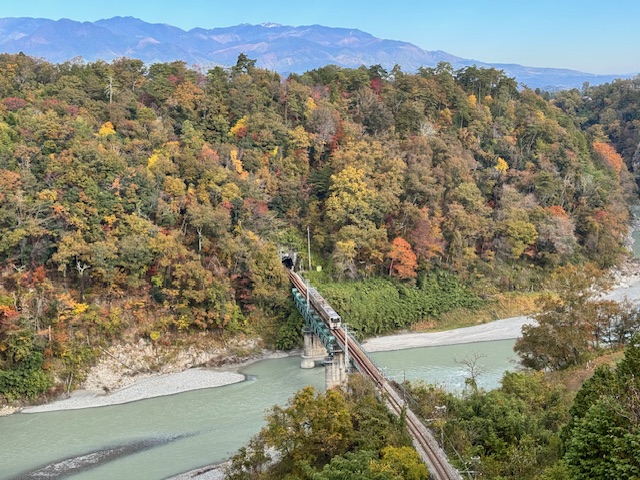 今年の秋は10月が暖かく、11月になって急に寒くなったこともあって、比較的きれいに木々が色づいている。昨日の信濃毎日新聞に、飯田線の唐笠駅上から眺めた天竜川沿いの紅葉写真が載っていたので、電車の時刻を確認して写真を撮りに行った。