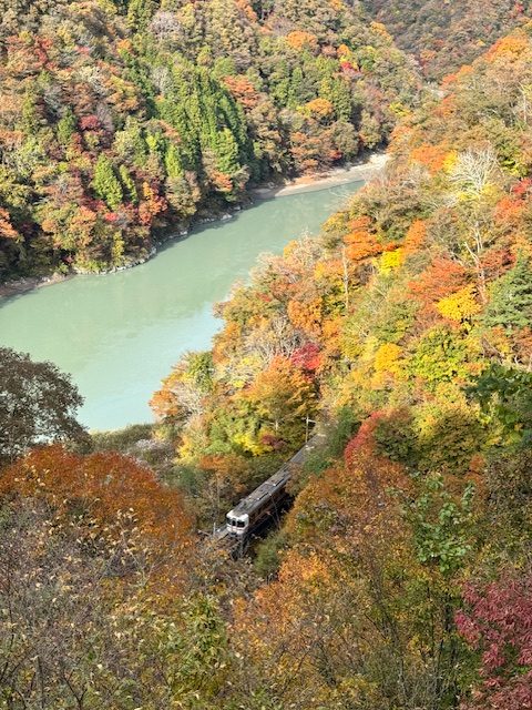 飯田線が見下ろせる泰阜村の県道64号線のカーブには、すでに三脚を構えて電車が来るのを待っているカメラマンがいた。諏訪から来たとのことで今年はいつになく紅葉がきれいだと言っていた。