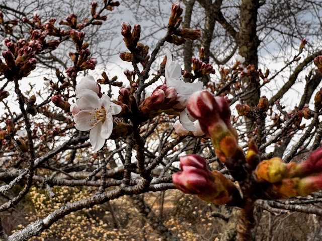 今年の3月は4月のような天気が続き、この暖かさで南信州はこの1週間で一気に桜が開花して、どこの桜も8分咲き程度になってしまった。我が家の基準木であるお経山の桜は寒い西風にあたるので他の桜より開花が遅いのだが、さすがにこの陽気で開花した。昨年より10日早い開花である。桜の横にあるモクレンの花は3月初旬から咲き始めたのですっかり黄色に変色してしまった。長期予報によると4月、5月も平年により気温が高いようだ。今年も猛暑になるのかと思うと気が重い。